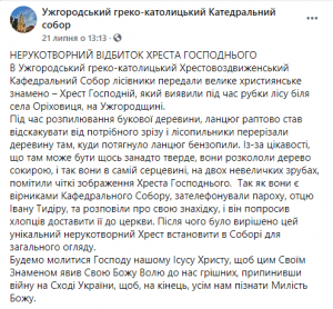 “Будемо молитися Господу нашому Ісусу Христу, щоб цим Своїм Знаменом явив Свою Божу Волю до нас грішних, припинивши війну на Сході України, щоб, на кінець, усім нам пізнати Милість Божу” – йдеться в дописі.